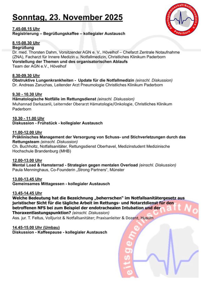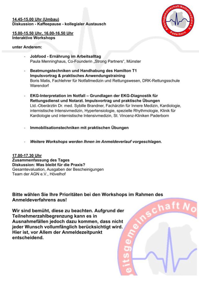 Um an beiden Tagen teilnehmen zu können, ist es erforderlich sich jeweils für Samstag und Sonntag anzumelden. Bei Rückfragen wenden Sie sich gerne per Email an "fortbildung@agn-online.de